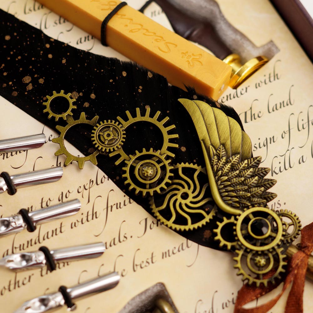 ست کالیگرافی قلم پر چرخ دنده نگینی ویژه با مهر و موم Calligraphy set feather pen Special gear with sealing wax