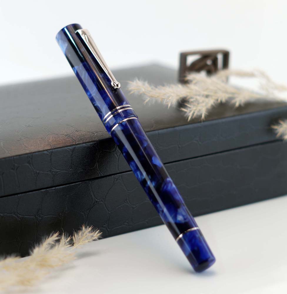 بدنه ی خودنویس ژورنال آبی از رزین ایتالیایی مرغوب ساخته شده که به صورت دستی تراشیده و پرداخت شده است. این رزین با طرح مرمری و رنگ آبی عمیق، تصویری شبیه به سنگ های گرانبهای طبیعی ایجاد می کند. انتخاب این رنگ و طرح نه تنها نمایی شیک و متفاوت به قلم داده، بلکه آن را به گزینه ای جذاب برای کسانی که به دنبال ظاهری خاص هستند تبدیل کرده است.