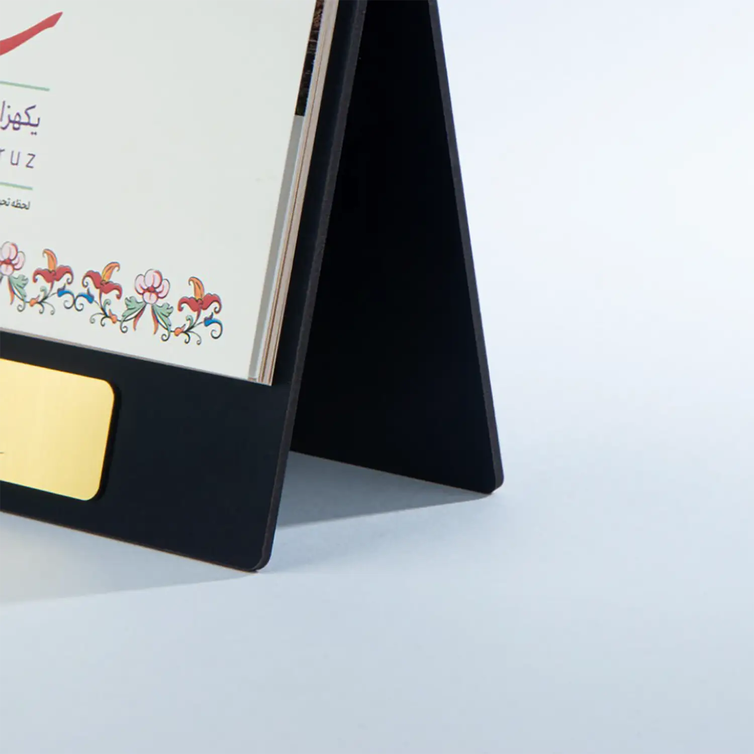 برند :ایمان Iman نوع : تقویم رومیزی مدل : ماکان Makan جنس پایه ی تقویم : MDF نوع صحافی : فنر دوبل کاغذ : مقوایی گلاسه ابعاد پایه ی تقویم : 20*15 سانتی متر ابعاد تقویم : 11.2*21 سانتی متر فضای تبلیغ (درج لوگو یا لیزر) : 14*2.5 سانتی متر تعداد برگ : 14 صفحه تنوع رنگ : مشکی